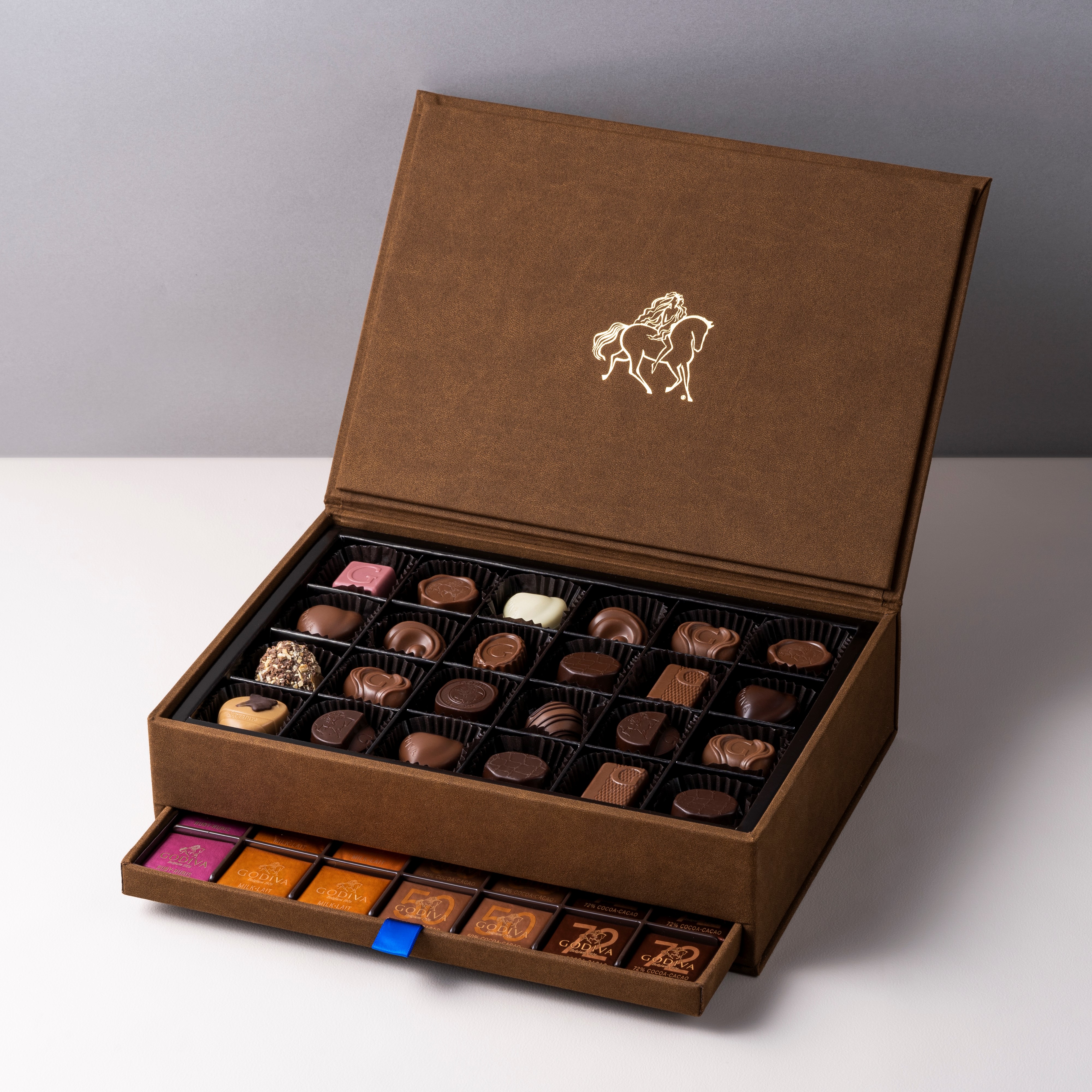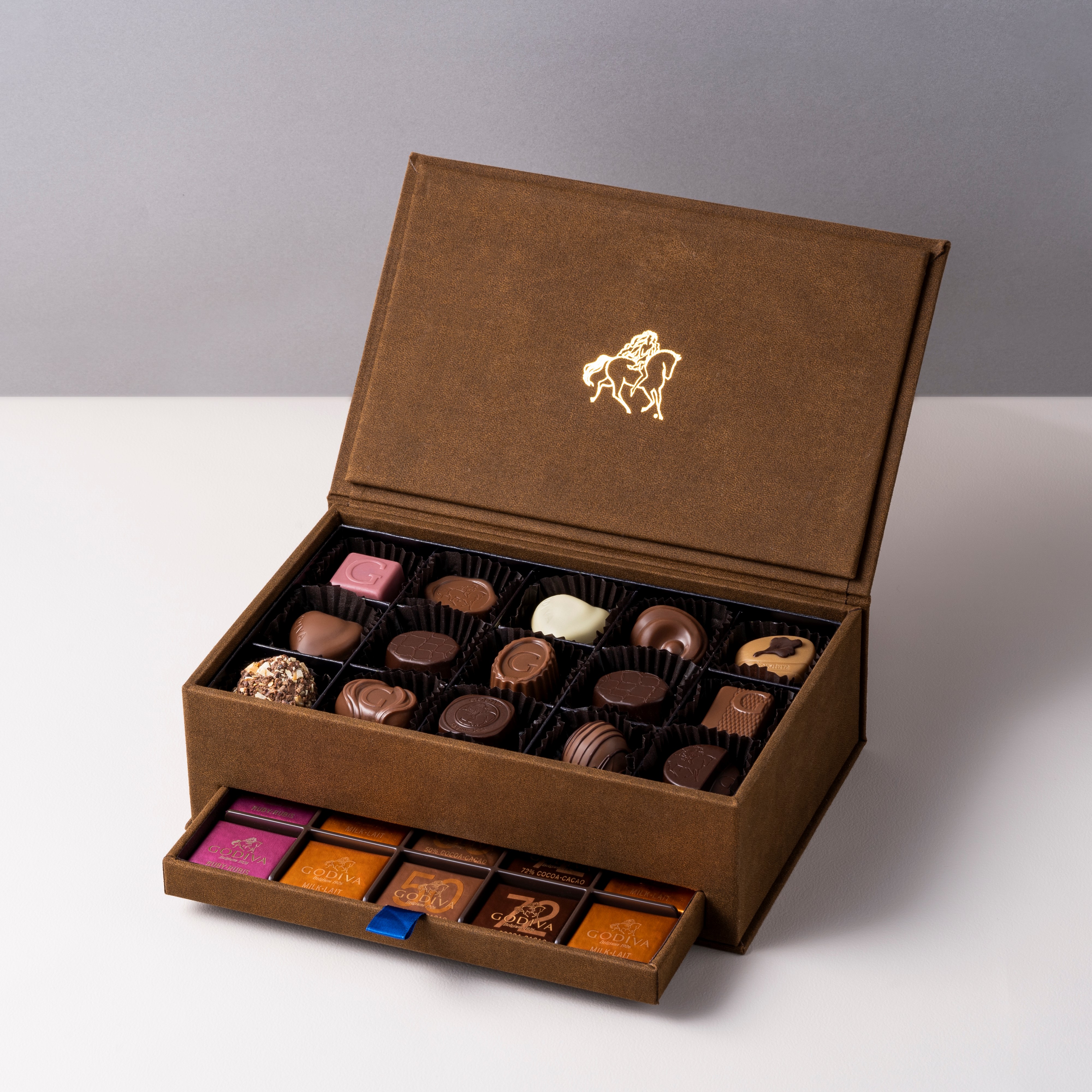この中世の香り漂う広場の名前を冠したゴディバのグランプラスは、ゴディバを代表するチョコレートと個性豊かな味わいのトリュフ、シンプルなカレを端整なパッケージに詰め合わせたプレミアムな逸品。